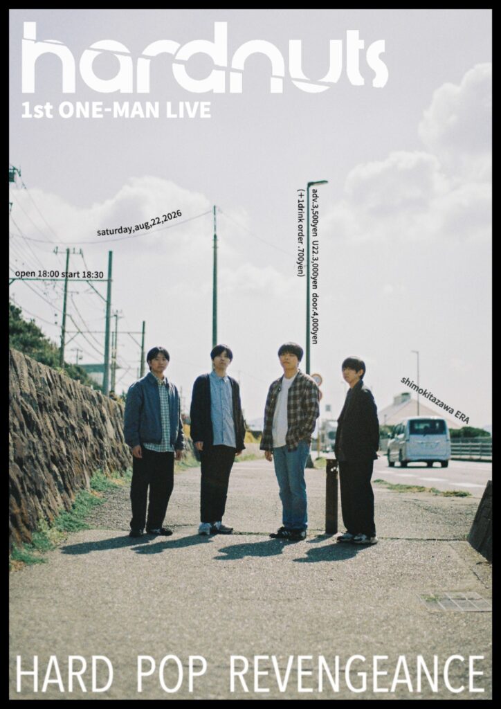 オルタナティヴ・ロック・バンド、hardnutsがワンマン・ライブ「HARD POP REVENGEANCE」を2026年8月22日(土)に下北沢ERAにて開催する。hardnutsにとって初のワンマン・ライブとなる。