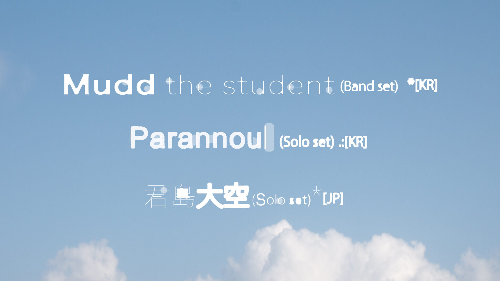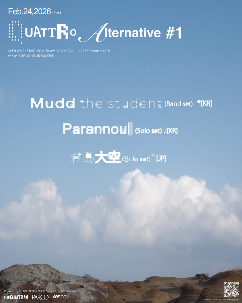 シリーズ初回には、韓国よりMudd the student(from Balming Tiger)とParannoul、日本国内のアクトは君島大空が出演。三者三様でありながらも、境界をクロスオーバーさせ、枠組み自体の更新を想起させる出演者がアジアの垣根を超えて集結する。また、本企画はMudd the studentの作品『LAGEON』のジャパン・ツアーを兼ねたダブル・ネームの公演でもある。