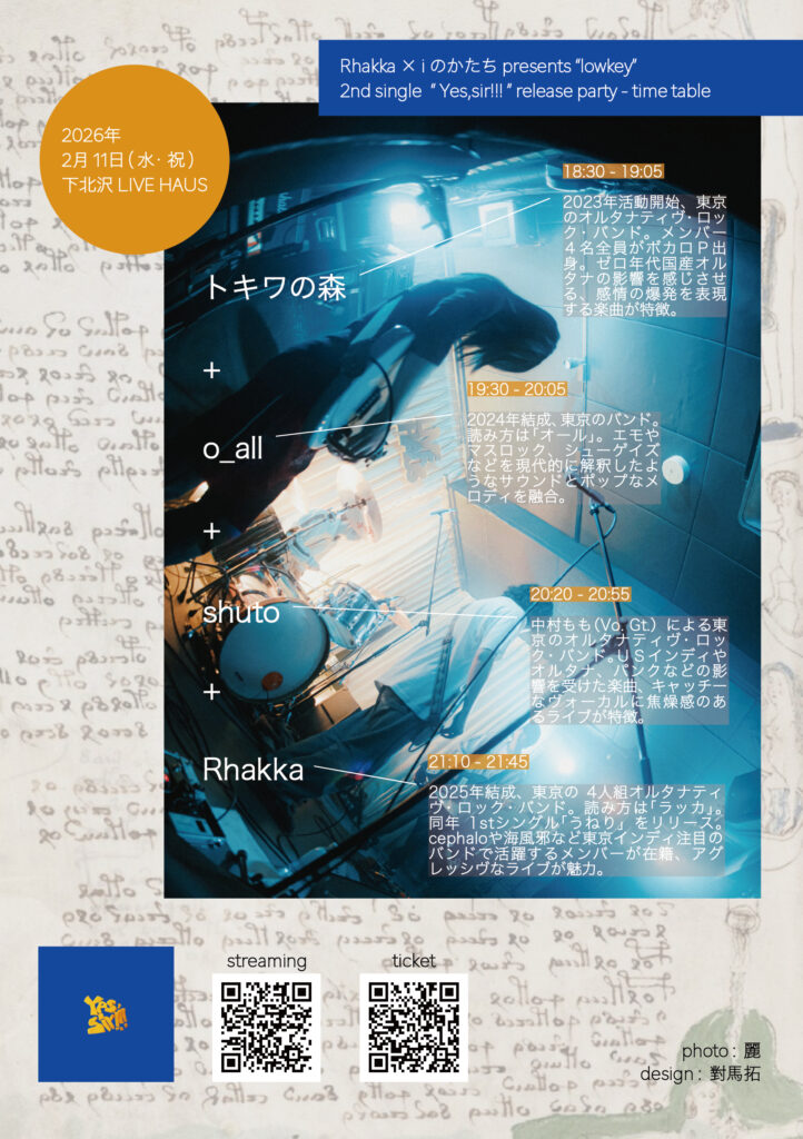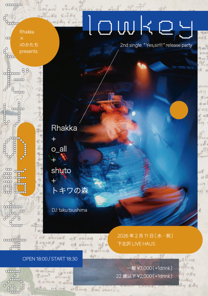 東京の4人組オルタナティヴ・ロック・バンド、Rhakka(ラッカ)が2ndシングル「Yes, sir!!!」をリリース。これに伴い、ライブ・イベント『iのかたち』との共同自主企画『lowkey』を、2026年2月11日(水・祝)に東京 下北沢LIVE HAUSにて開催する。